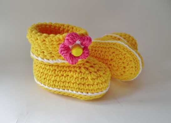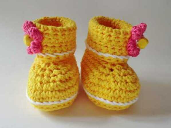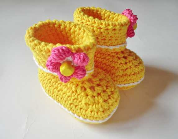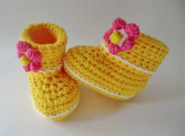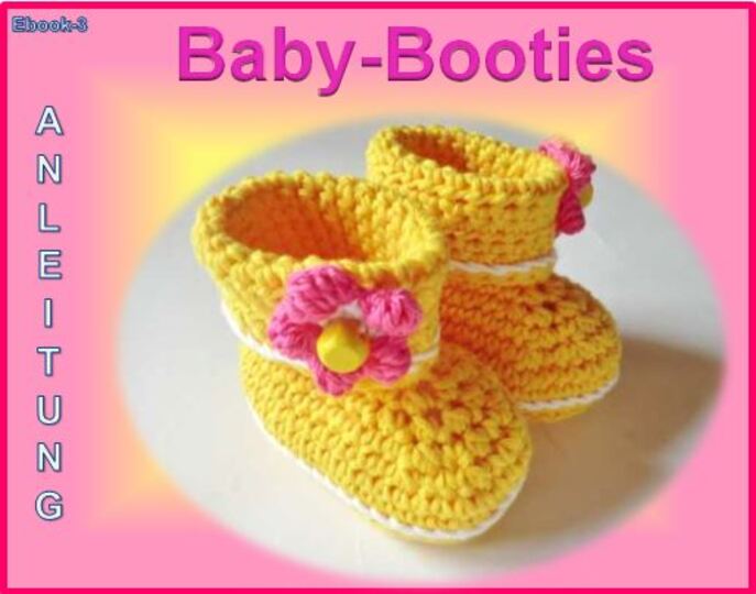 Ausführliche 8 seitige Häkelanleitung mit vielen Fotos zum Häkeln von Baby-Booties mit der Sohlenlänge von 9 cm.