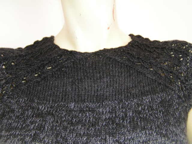 Die Arme stellen eine Art Raglan dar. Für den Ausschnitt wurden verkürzte Reihen gearbeitet. Deshalb ist das Modell für ungeübte StrickerInnen nicht geeignet.