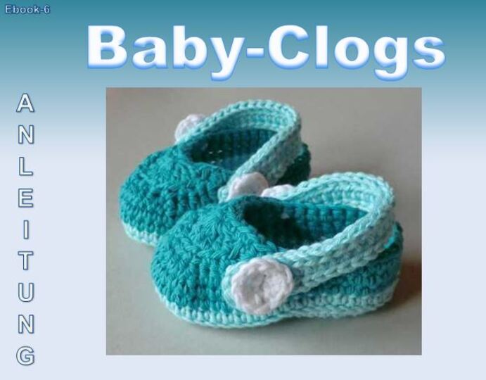 Ausführliche 6-seitige Häkelanleitung mit vielen Fotos zum Häkeln von Baby-Clogs mit der Sohlenlänge von ca. 9,5cm und 10,5cm.