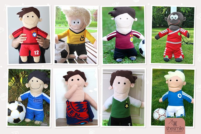 Ein Gesicht mit großen und kleinen Augen, ein Wappen mit Herz, Stern und kleinen Sternen, Trikot-Nummern in klein und groß. Gestalte deinen Fußballstar nach deinem Geschmack. Nutze dafür die Stick- und Plotterdateien oder appliziere die Elemente mit der Nähmaschine.