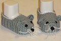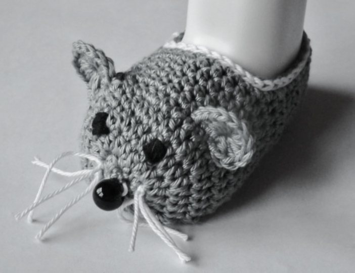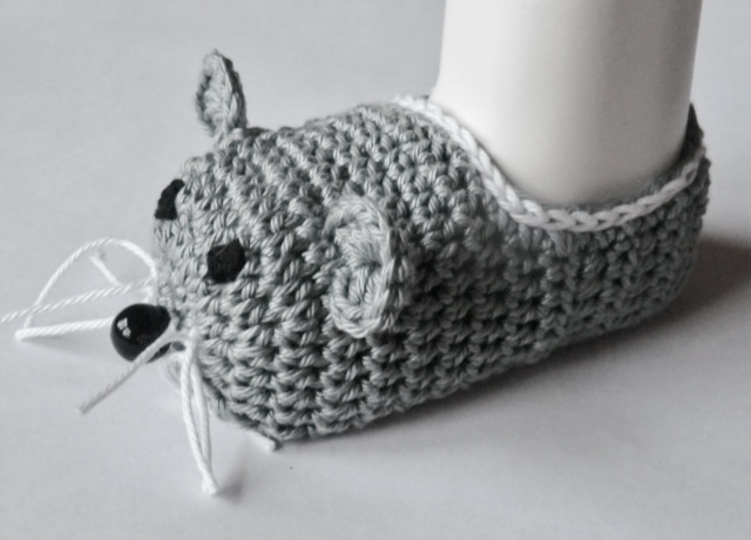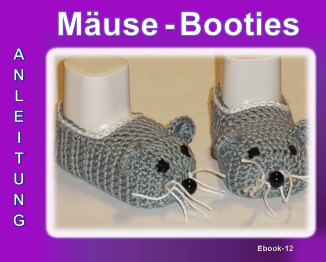 Ausführliche 5-seitige Häkelanleitung mit vielen Fotos zum Häkeln von Mäuse Booties mit der Sohlenlänge von ca. 10 cm.