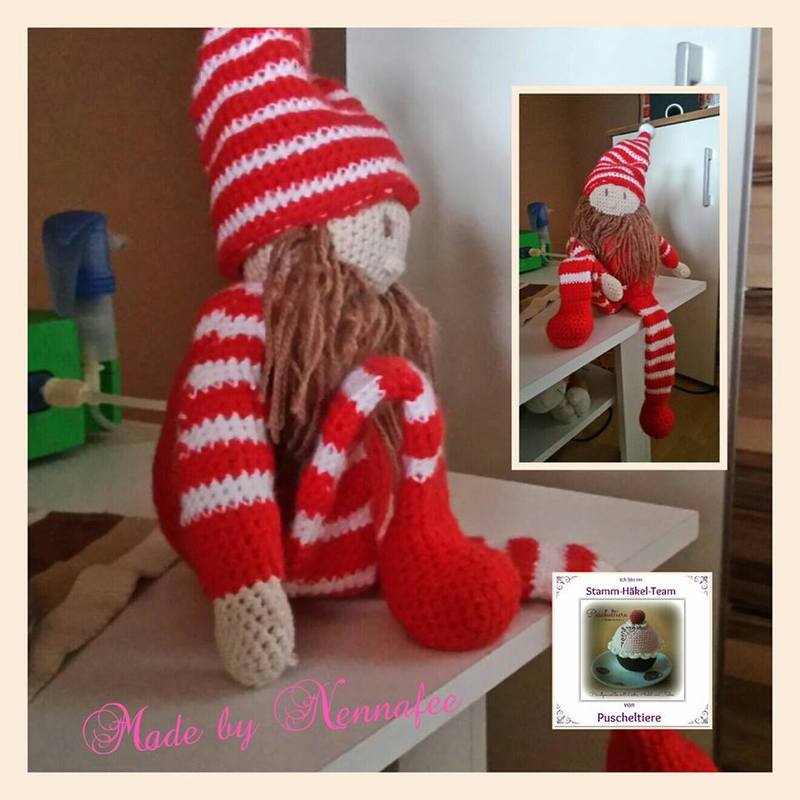 Der Wichtel auf dem Foto wurde mit einer Wolle 50g/125m und Nadelstärke 2,5 gehäkelt.