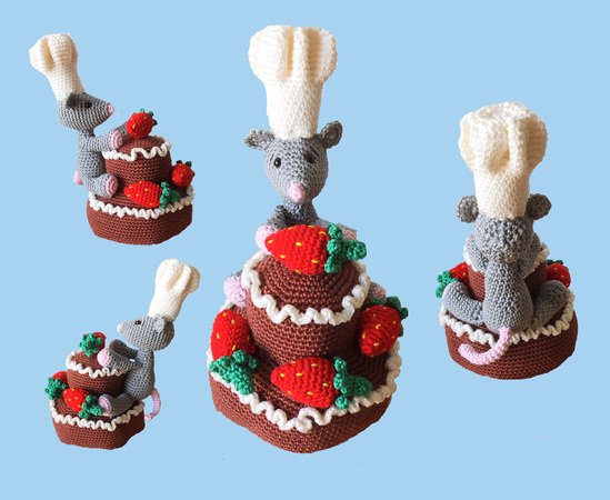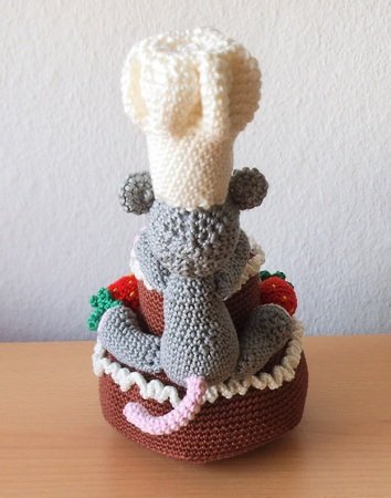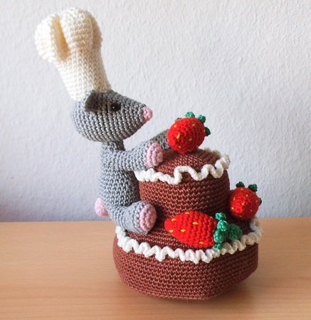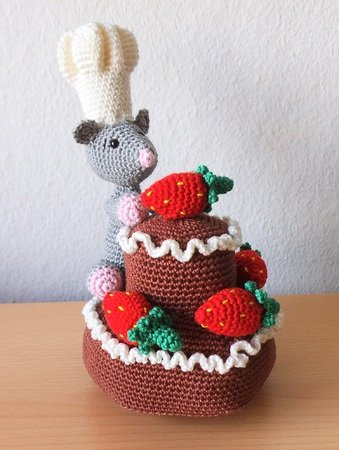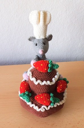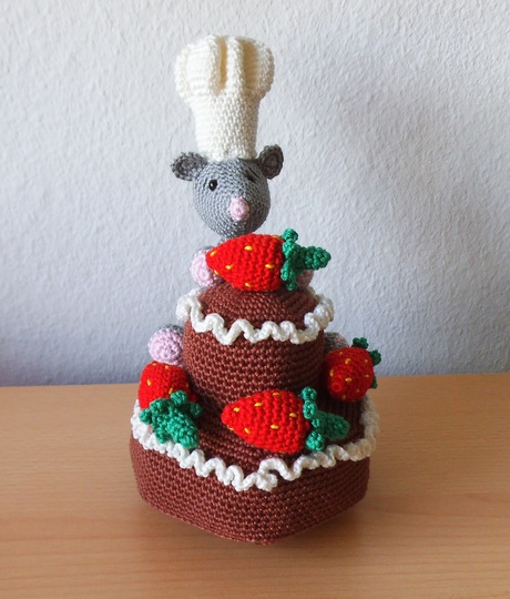 Eine Erdbeer-Schokotorte mit Sahnerand vom Meisterbäcker persönlich zubereitet und serviert, wobei der Mäusebäcker-Meisterbäcker sie wohl lieber für sich ganz alleine haben will.