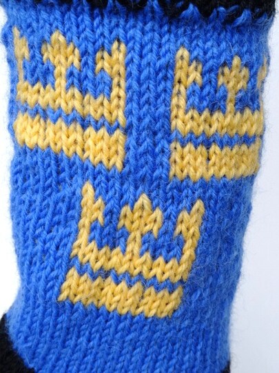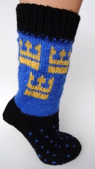 Strickanleitung für Socken mit schwedischem Kronenmotiv für Gr. 41 in den Schwedenfarben blau/gelb. Für diese Socken sollte man Übung im Sockenstricken mit einem Nadelspiel haben, in der Runde und zweifarbig stricken können. Die Anleitung umfasst 4 Seiten und enthält eine detailierte Beschreibung mit Mustercharts zum Stricken.