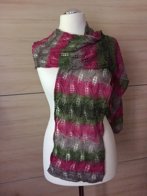 Dieser Schal wird aus sehr dünnem Merino Lacegarn gestrickt. Ihr benötigt 100g. Damit wird der Schal 200 x 25 cm groß. Ihr erhaltet eine leicht verständliche Anleitung mit Strickschrift und Bildern.