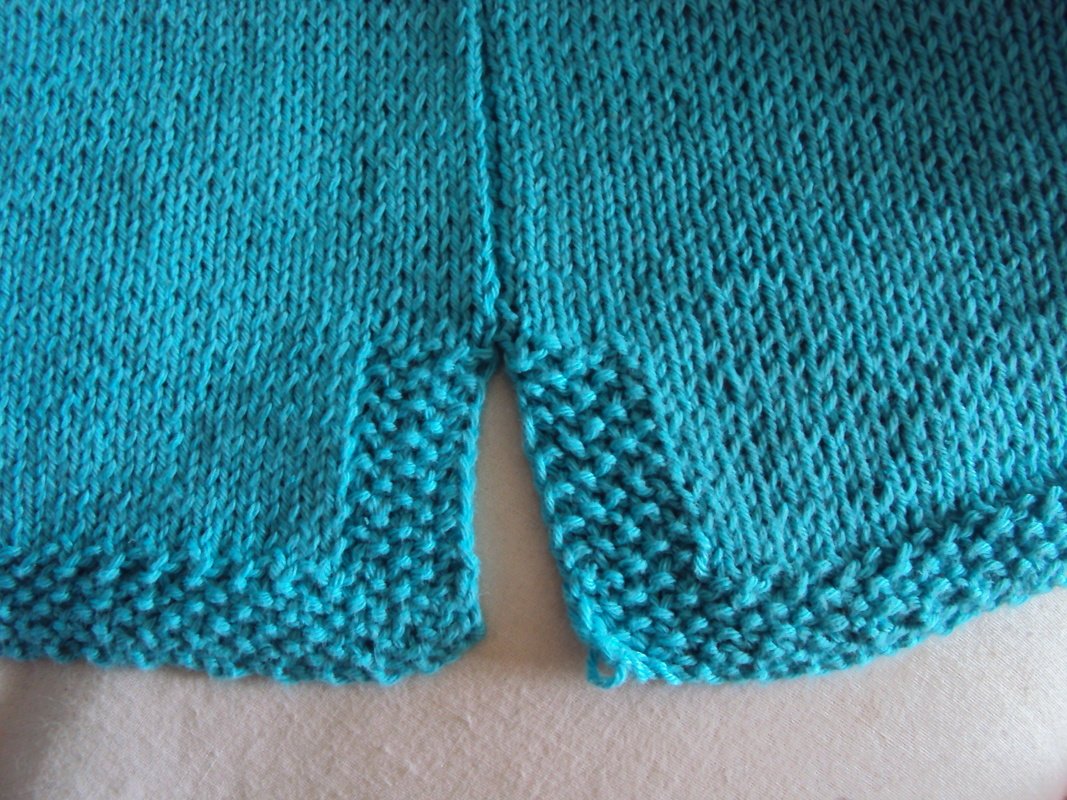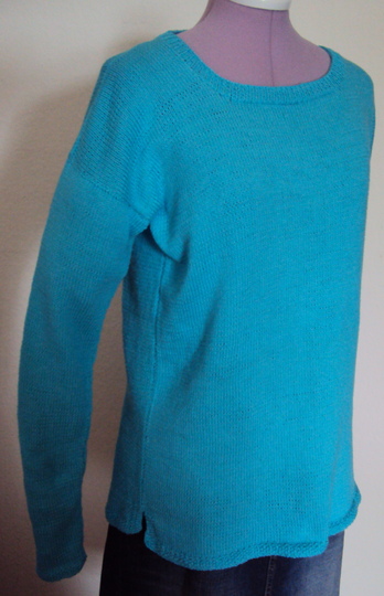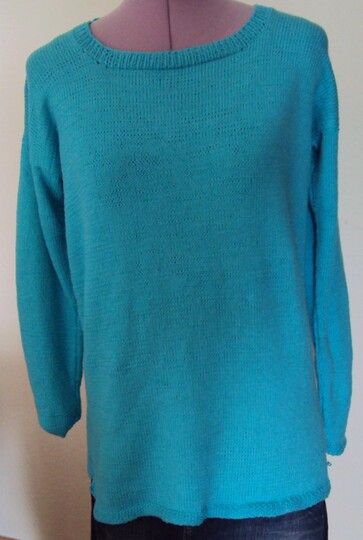 Strickanleitung für einen Sommer-Pullover, der natürlich das ganze Jahr über getragen werden kann, aus dünnem Baumwollgarn in Türkis.Die Größe ist S/M passend bis maximale Brustweite ca. 97 cm.