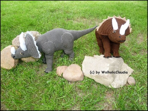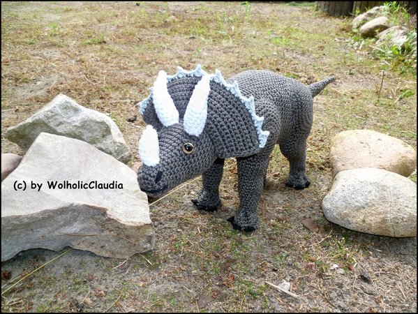 Der Triceratops ist bei angegebener Nadel- und Wollstärke ca. 43 cm lang und hat eine Höhe von 17 cm.