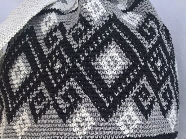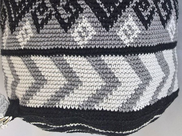 der Taschenboden ist ausführlich beschrieben, also jede Runde mit den Zunahmen. Dann gibt es das Zählmuster natürlich sowie die genaue Beschreibung der Träger, wo und wann was angehäkelt wird usw. Bis jetzt kamen noch keine Beschwerden^^