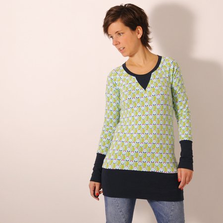 Hab dieses Shirt mehrmals genäht in verschiedenen Variationen. War sehr einfach umzusetzen. Toller Schnitt. Hab mir aus diesem Schnitt zusammen mit nen bequemen Schlupfhosenschnitt 2 kuschelige Schlafanzüge genäht. Super ist auch dass es den Schnitt in Größeren Größen gibt, da ich klein und mollig bin.