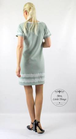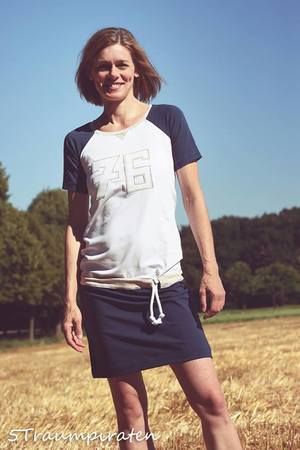 Wir haben bereits kurze Ärmel eingebaut, eine hüftlange Shirt-Version und eine knielange Kleid-Version. Außerdem ist noch ein Hüftbündchen dabei, und ein kleiner dreieckiger Besatz, der das Shirt auf „vintage“ trimmt ist auch dabei.