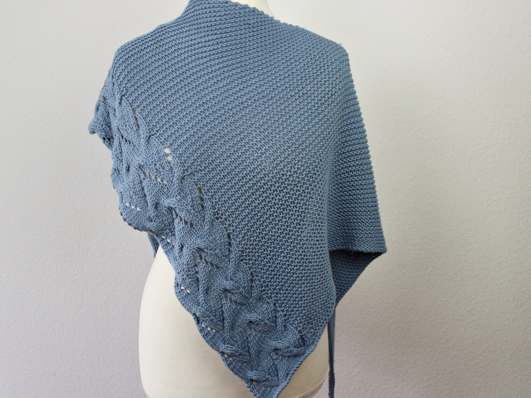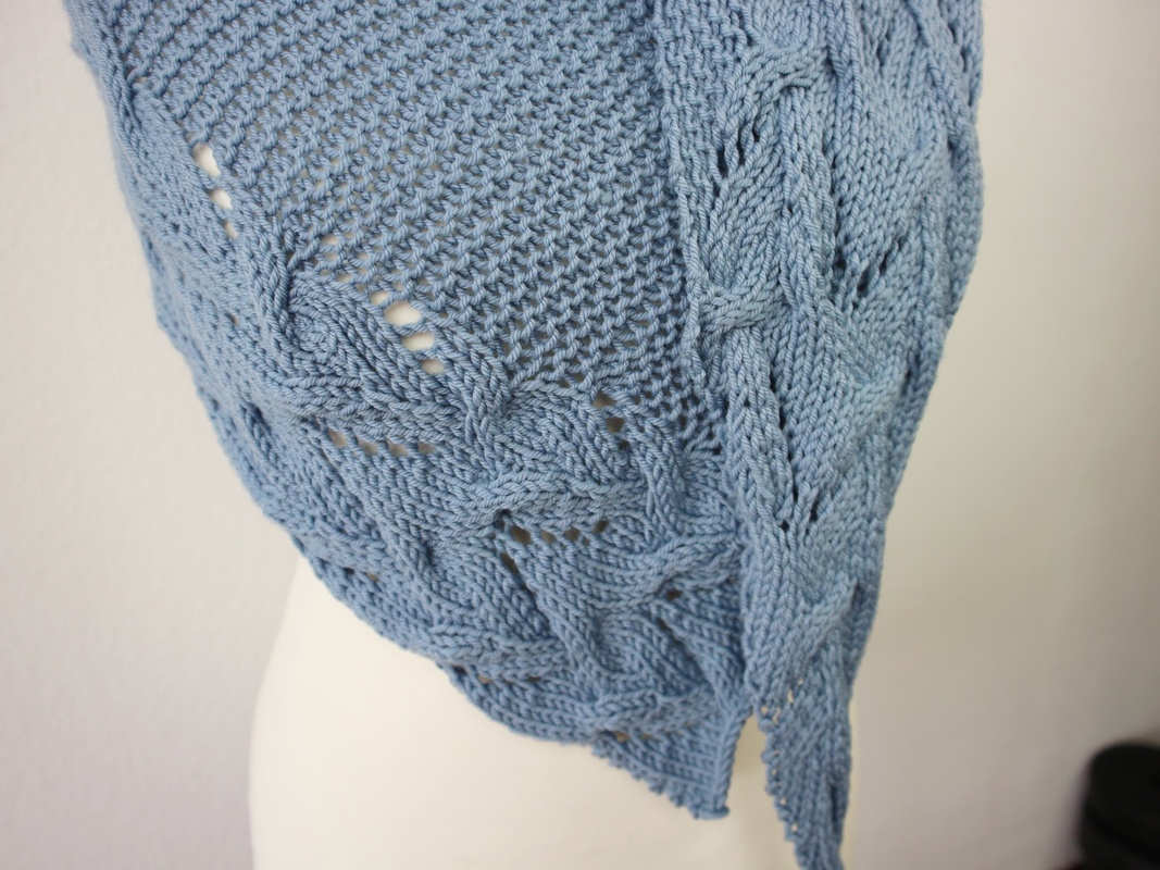 Das Tuch wird asymmetrisch von einer Spitze aus gestrickt und wächst durch regelmäßige Zunahmen.