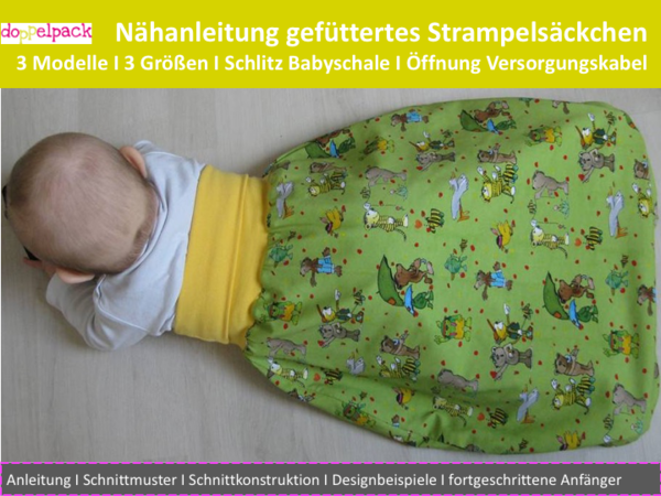 Wozu ein Strampelsäckchen? Die eigene Haut spüren, wie in Mamis Bauch, und dabei unbegrenzt strampeln, das lieben Babys und das können Sie in einem Strampelsäckchen. Der Strampelsack eignet sich tagsüber prima als Deckenersatz oder im Schlafsack auch als „Schlafanzughose". Je nach Jahreszeit kannst Du ein Sommer-, Winter- oder Übergangs-Säckchen nähen. Einfach entsprechende Stoffe wählen. Deiner Kreativität sind keine Grenzen gesetzt. Das hohe Bündchen kann bis unter die Achseln gezogen oder umgeschlagen werden. Damit das Baby eng pucken kann, können auch die Arme mit in das Säckchen gesteckt werden.