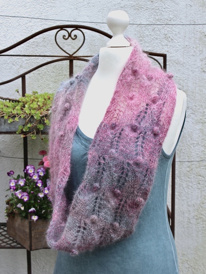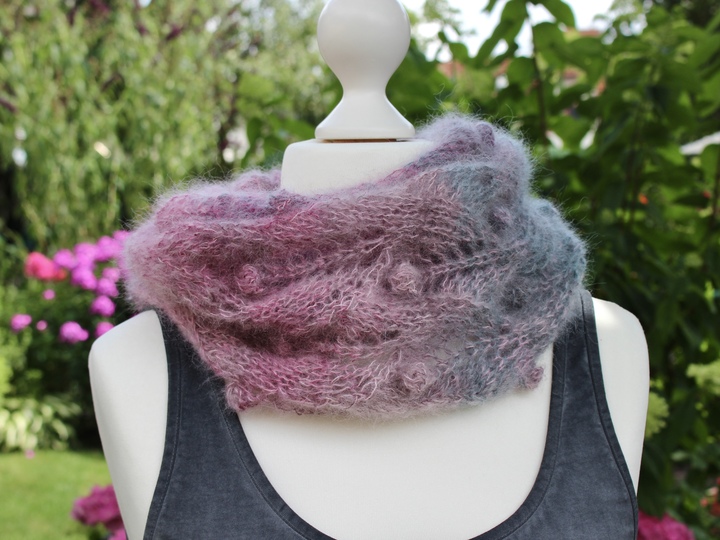 LILY ist ein ganz zarter, romantischer Loop mit einem einfachen Lochmuster und Noppen. Er ist mit 50 g Gewicht leicht wie eine Feder und Dank doppeltem Faden wirklich schnell gestrickt! Seinen wunderschönen Mélange-Effekt erhält er dadurch, dass das Farbverlaufs-Mohairgarn gleichzeitig von außen und innen abgewickelt und zusammen verstrickt wird! Du kannst aber auch ein Farbverlaufsgarn mit einer passenden Uni-Farbe kombinieren oder 2 unterschiedliche Uni-Farben – und auch einfarbig kommt das Muster toll zur Geltung! Der Loop lässt sich 2 x um den Hals wickeln und liegt dann halsnah an, du kannst ihn natürlich nach Wunsch auch länger arbeiten, brauchst dann aber mehr Garn.