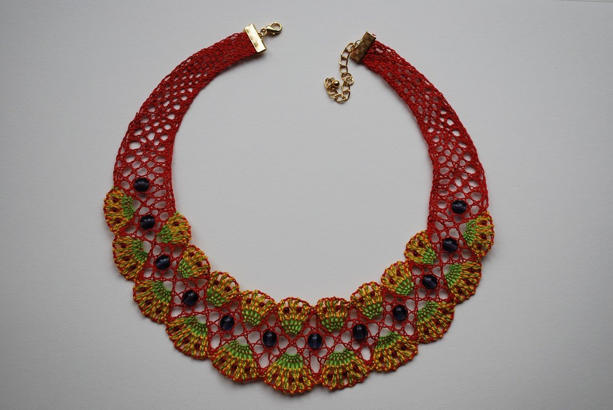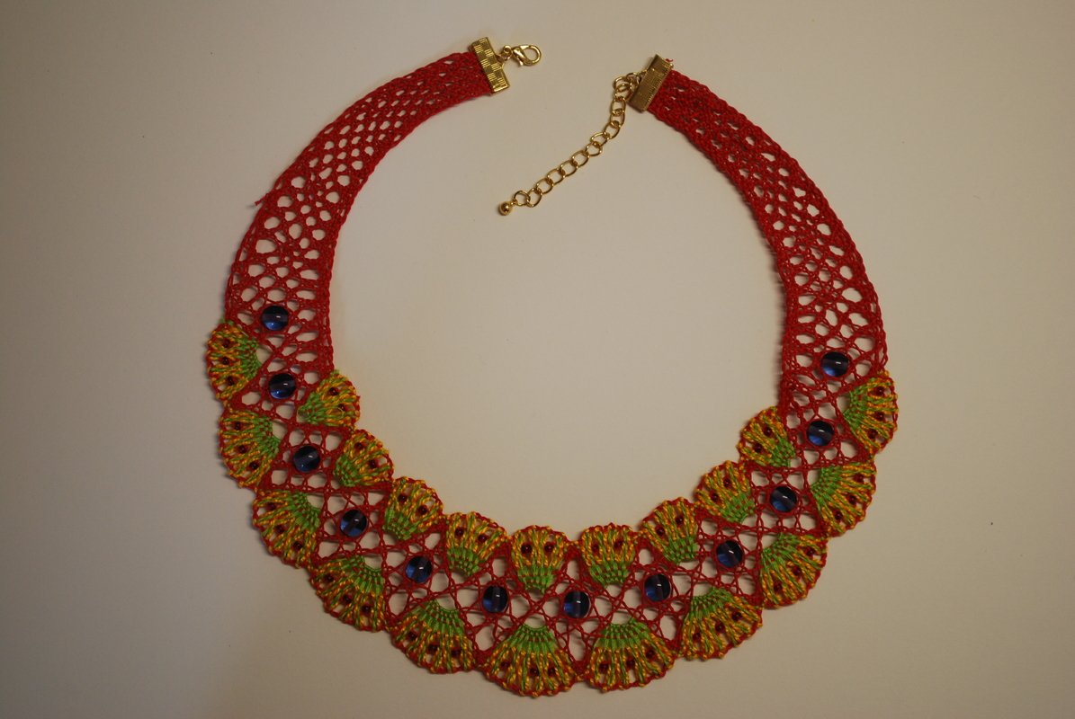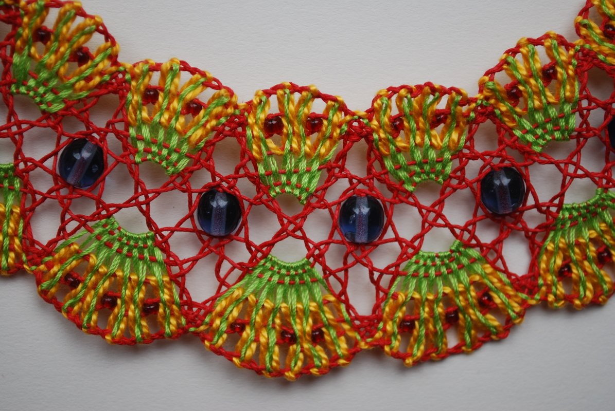 Die Anleitung ist für eine geklöppelte Kette von ca. 44 cm Länge und 5 cm Breite. Sie ist in einem Stück mit durchlaufenden Fäden gearbeitet.