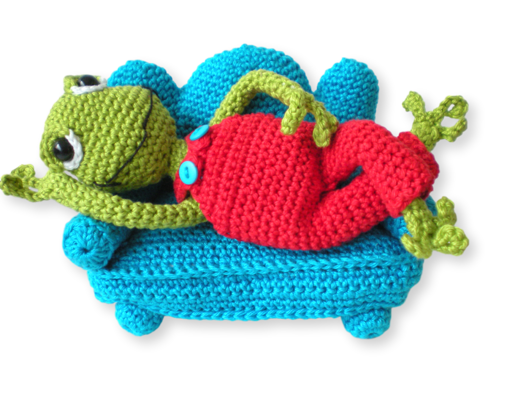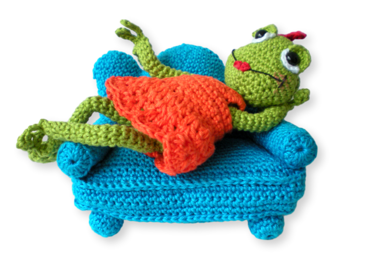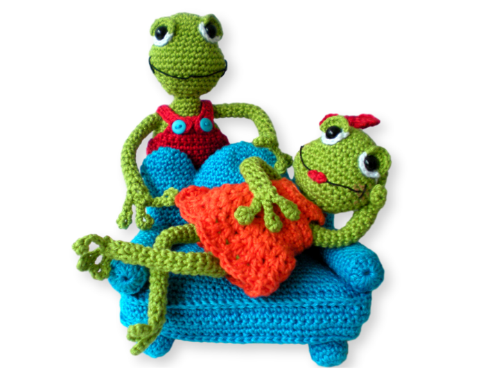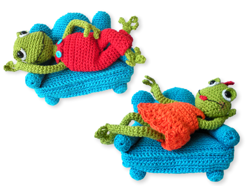 Eine ausführliche Häkelanleitung für die Frösche, das Kleid, die Hose und das Sofa. Alles ist ausführlich beschrieben und bebildert.