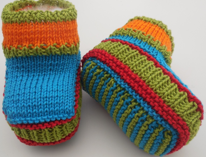 2. Babyschuhe: Die Schuhe haben eine Sohlenlänge von ca. 10 cm und wurden mit Nadelstärke 2,5 und Wolle mit einer Ll von 125 m pro 50 g gestrickt. Sie sind auch sehr gut zum Resteverwerten geeignet. Hier sollte man außer den üblichen Grundkenntnissen noch rechte Maschen verschränkt zusammenstricken können.