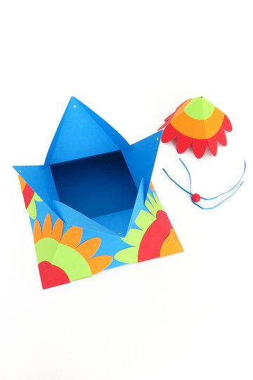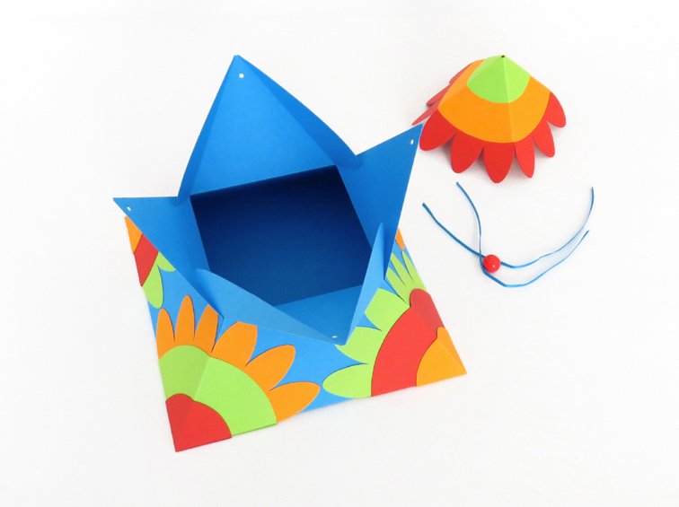 Die Pyramide passt besonders gut für kleine textile Geschenke (z. B. Sommerschals, Tücher u. Ä.) oder Süßigkeiten, Pralinen, Schmuck … – eben alles, was sich innerhalb der Verpackung mehr oder weniger gleichmäßig verteilen lässt. Du kannst aber auch unten in den Ecken ein paar Kleinigkeiten und in der Mitte ein größeres Geschenk (ein Kuscheltier?) platzieren.