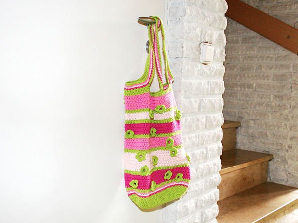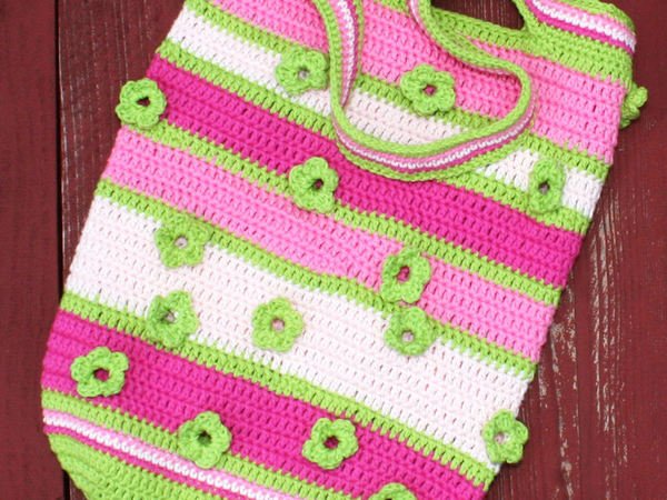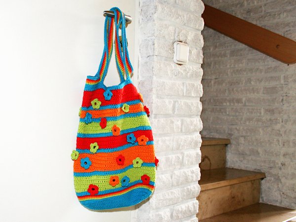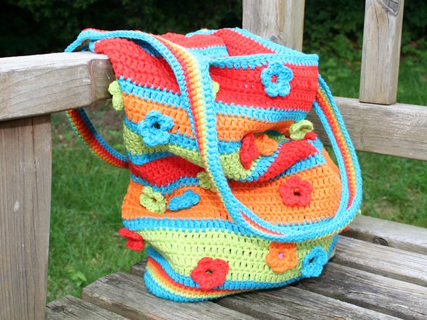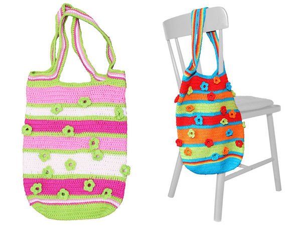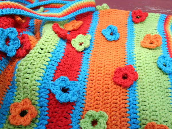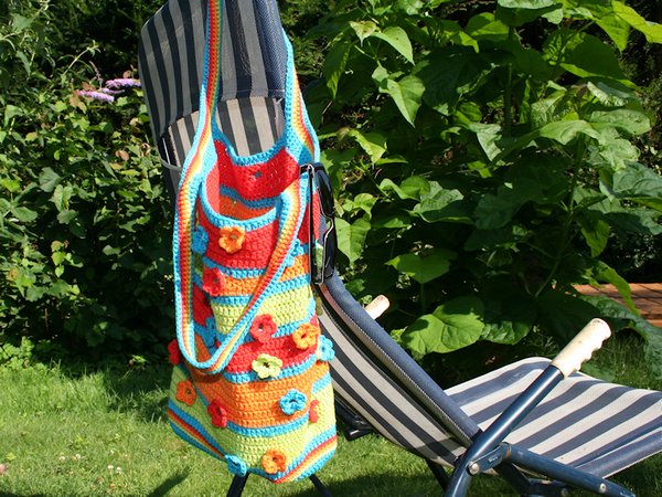 Diese farbenfrohe Tasche ist einfach zu häkeln und hat doch das gewisse Etwas: die aufgenähten Blümchen erlauben einen kleinen Einblick ins Innere!