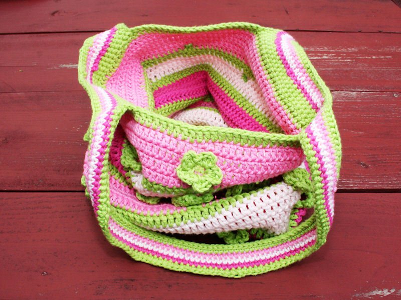 Die Anleitung enthält neben der genauen Beschreibung für die abgebildete Tasche auch eine allgemeine Anleitung, um den Boden (und damit die Größe der Tasche) beliebig anzupassen.