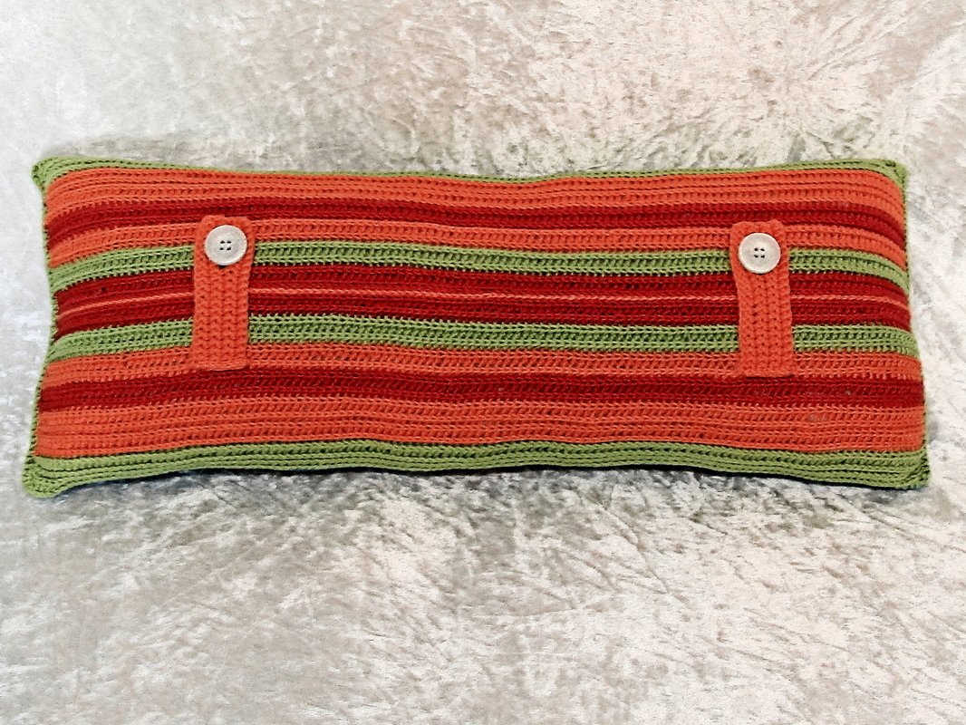 Die fertige Größe des Kissens beträgt bei Verwendung der vorgeschlagenen Wolle ca 53 x 23 cm