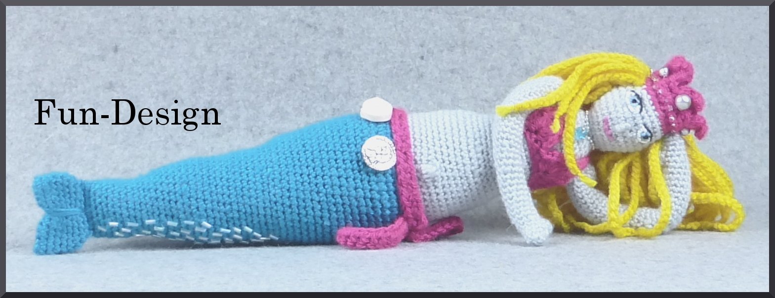 Es werden ca.20g Wolle in türkis (Schwanzflosse), ca.25g in grau(Körper), ca.20g gelb (Haare) für Nadelstärke 3 und kleine Mengen an pinker, weißer und schwarzer Wolle benötigt.