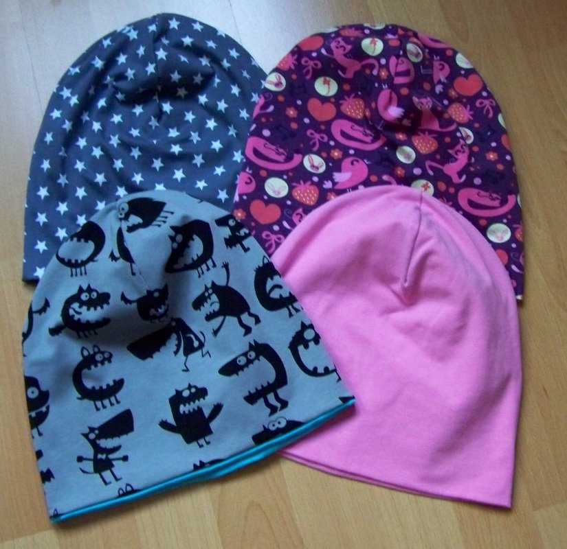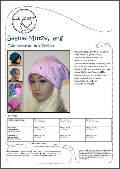 Das Ziel dieses Schnittmusters ist eine coole Mütze für große Kinder, Jugendliche und Erwachsene in typischer Beanie-Form. Zwei Varianten werden vorgestellt, eine Mütze aus nur einem Jersey-Stoff im Stoffbruch und eine Mütze aus zwei Jersey-Stoffen zum Wenden.