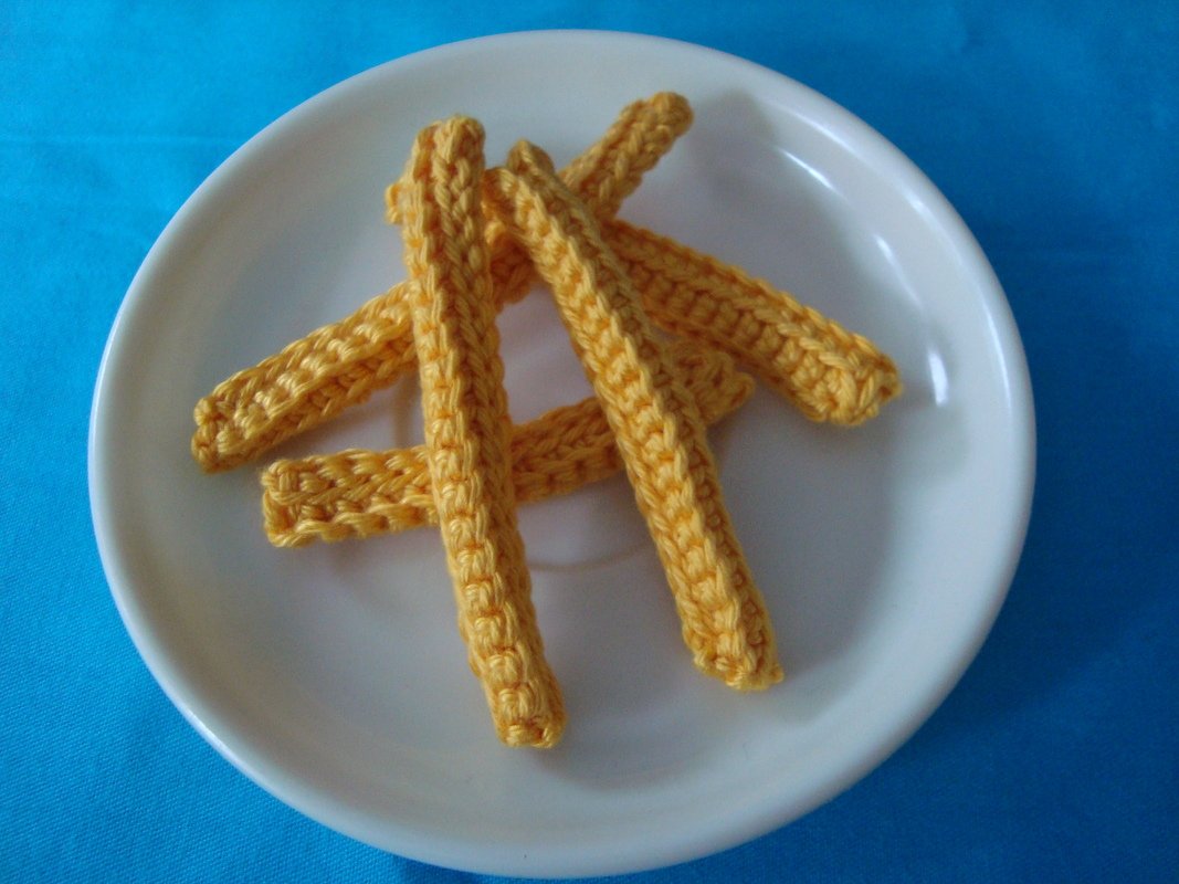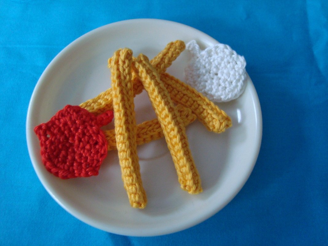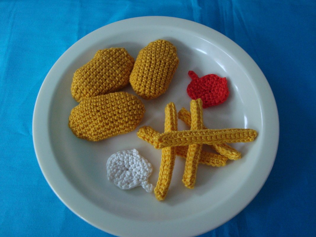 Ich biete hier eine selbst entworfene Anleitung zum Häkeln von Pommes Frites, Chicken Nuggets mit Mayo und Ketchup für die Kinderküche oder den Imbiss im Kaufladen.