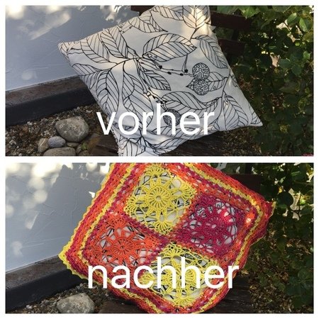 Mit dieser Anleitung für einen Kissenbezug kannst Du Deine alten Kissen aufpeppen. Einfach drüberziehen und schon hast Du ein neues Kissen. Der Untergrund kann einfarbig oder gemustert sein, durch das großzügige Häkelmuster entstehen interessante neue Optiken!
