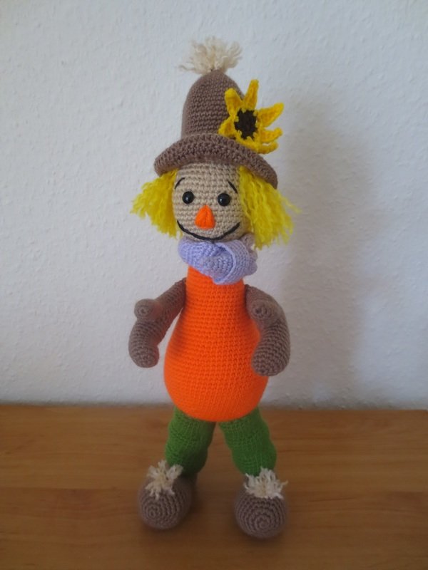 Die endgültige Größe ist je nach Garn und Nadelstärke verschieden. Die Größe der Kürbis-Scheuche auf dem Bild ist mit Nadelstärke 3 ca. 38 cm hoch.