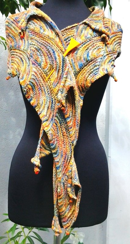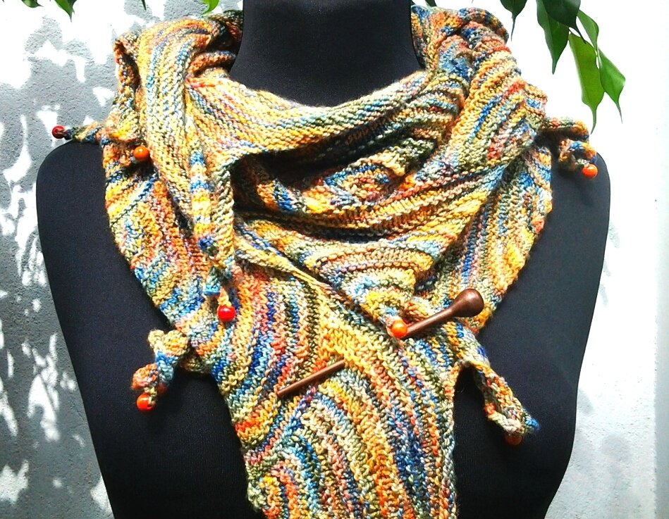 Du kannst ihn aus Resten, Verlaufsgarn oder - wie in der Abbildung - aus 150 g Koigu KPPPM stricken, ein richtiges Luxusexemplar, das an den Zipfelenden mit kleinen Holzperlen vollendet wurde.