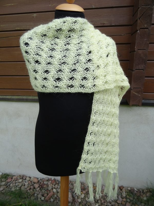 Strickanleitung für eine Stola mit Kreuzgeflechtmuster. Die Stola ist ohne Fransen ca. 35 cm breit und 220 cm lang.