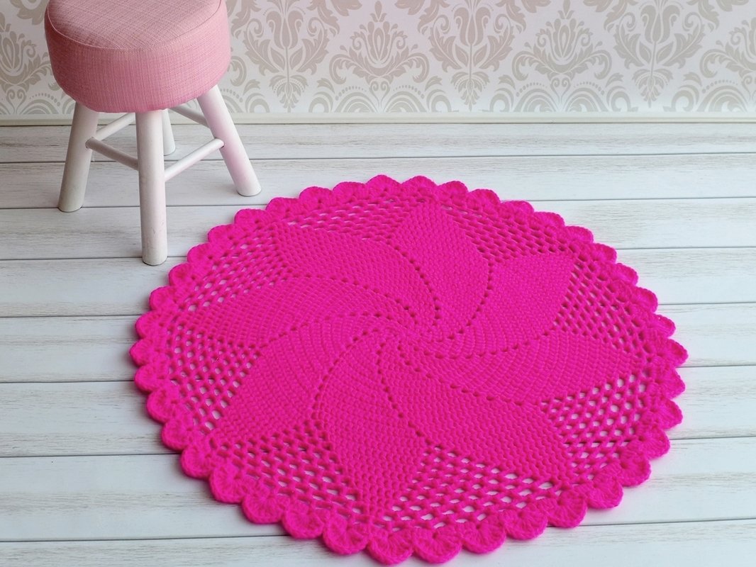 Die Anleitung ist sehr gut für Häkelanfänger geeignet. Wir häkeln Luftmaschen, Feste Maschen, Stäbchen und Doppelstäbchen. Meine ausführliche Schritt-für-Schritt-Anleitung führt Euch auf 17 Seiten Runde für Runde zu Eurem Traumteppich. Er passt wunderbar ins Kinderzimmer, vor die Balkontür, auf den Balkon, ins Bad oder in den Flur. Die Rückseite ist gummiert, so dass er nicht verrutscht. Der pinkfarbene misst 95 cm im Durchmesser, der weiße ist etwas kleiner. Eine Häkelgrafik ist dabei.