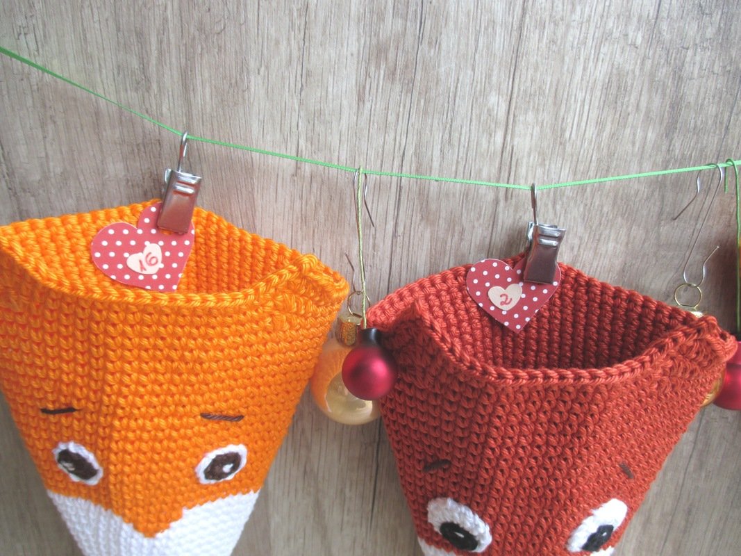 Die Füchse werden mit Catania-Baumwolle und Nadelstärke 2,5 etwa 19 cm hoch und (an der breitesten Stelle) 11 cm breit. Natürlich kannst Du auch andere Wolle verwenden - die Spitztüten werden dann entsprechend größer oder kleiner.