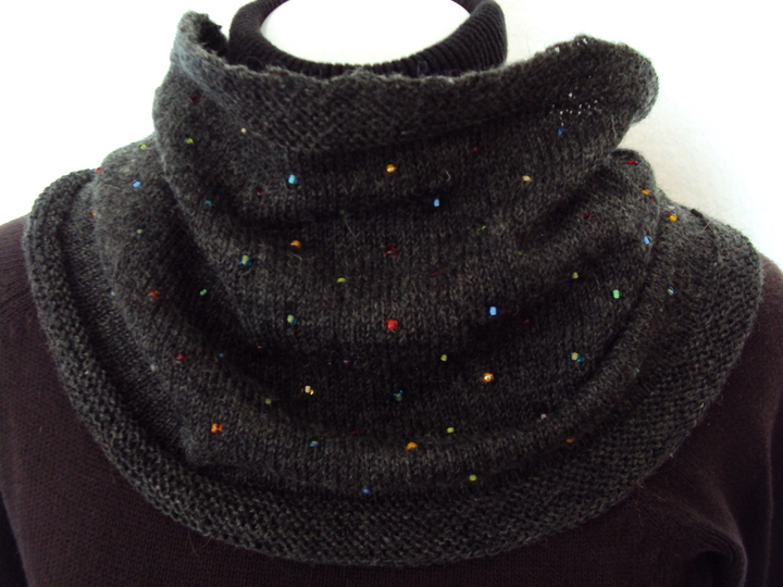 Dieser Cowl wird aus anthrazitfarbener Sockenwolle in der Runde gestrickt. Die kleinen bunten Perlchen werden einzeln eingestrickt, dies wird in der Anleitung extra mit Bildern erklärt. Die Anleitung umfasst 6 Seiten mit vielen Bildern.