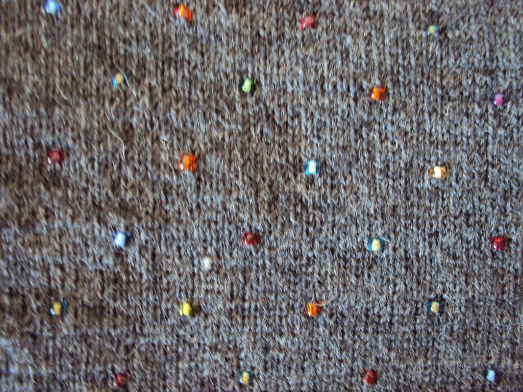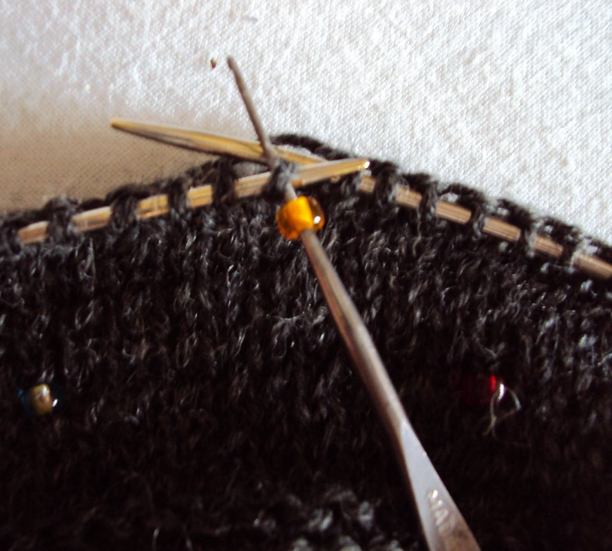 Man braucht 100 g Sockenwolle, eine Rundstricknadel Nr. 2,5 eine Häkelnadel Nr. 1 oder kleiner (wie sie für für Taschentuchspitzenhäkelei verwendet wird) um die Perlen einzuhäkeln und 190 Stück Rocailles in 4 mm Größe.
