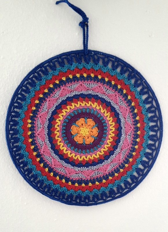 Dieses schöne Mandala in kräftigen Farben sitzt in einem Ring mit dem Durchmesser 30 cm