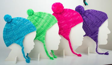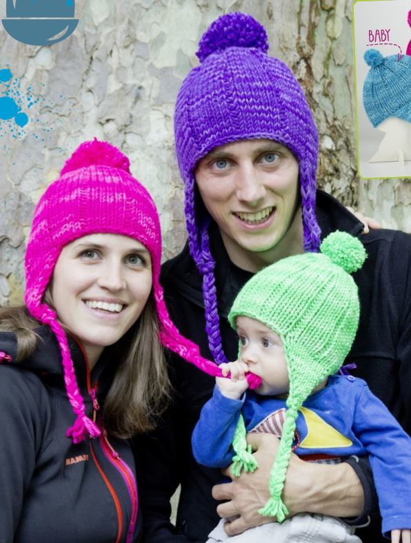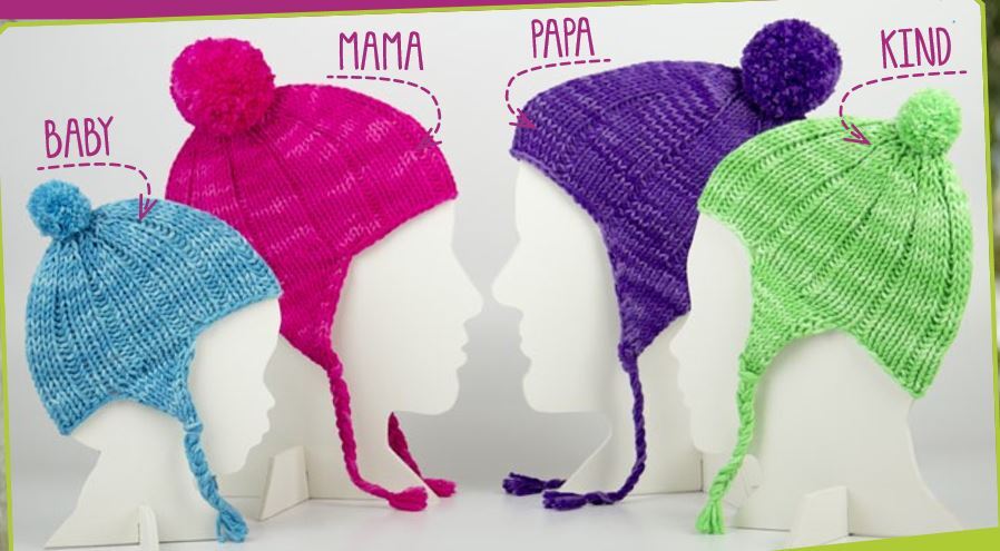 Material: für die Baby- und Kindermütze 100 g, für die restlichen Mützen 200 g in beliebiger Farbe „hatnut fun“ (50% Schurwolle, 50% Polyacryl, LL = 110 m/100 g) von PRO LANA. 1 Nadelspiel und für die größeren Mützen zusätzlich 1 kurze Rund-Stricknadel Nr. 7.
