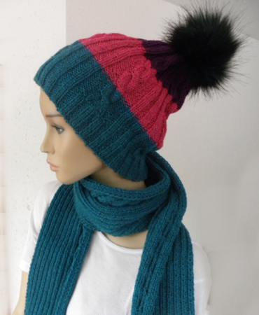 Material für die Mütze: je 1 Knäuel in Petrol (Farbe 107), Pink (Farbe 108) und Lila (Farbe 109) „hatnut fitness“ (52% Schurwolle, 20% Polyacryl, 18% Polyamid, LL = 420 m/50 g) von PRO LANA. 1 Nadelspiel und 1 kurze Rund-Stricknadel sowie Stricknadeln Nr. 4. Eine Zopfnadel, 1 Kunstfellbommel von Pro LANA