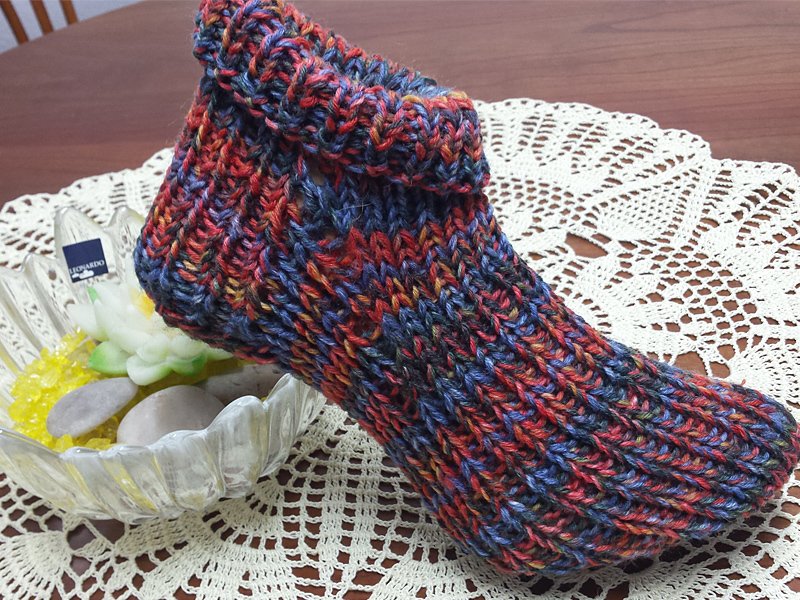 Gestrickt wird mit Nadelspiel Nr. 5 und einer 8fach Sockenwolle oder 2fädig mit einer 6fach und einer 4fach Sockenwolle 3fädig.