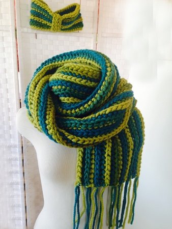 Patentmuster-Schal mit Stirnband - gehäkelt Größe - Schal: 210 x 20 cm Größe – Stirnband: 52 – 56 cm Kopfumfang Material: 150 g Petrol color (Farbe 84) „Collection Wolke Hegenbarth - Iceland Magic“ (49% Wolle, 48% Polyacryl, LL = 55 m/50 g) je 150 g Petrol (Farbe 69) und Apfelgrün (Farbe 74) „Collektion Wolke Hegenbarth – Urban Roots“ (97% Merino extra fine, 3 % Polyamid, LL = 60 m/50 g) vo Langendorf-Keller.de www.PRO-LANA.de