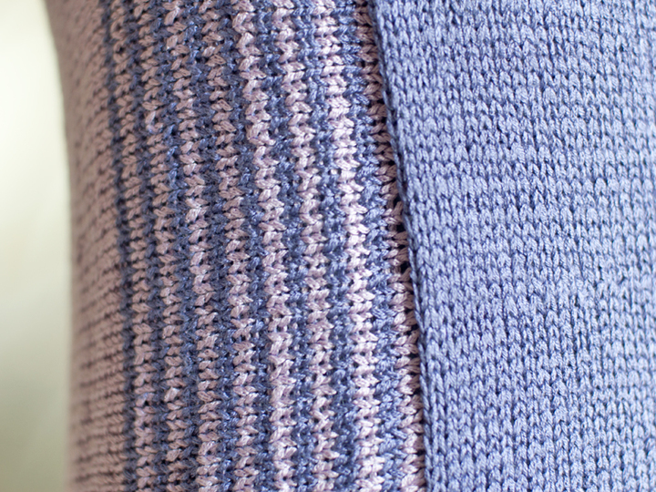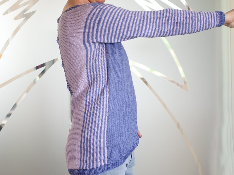 Wer jemals versucht hat, Längsstreifen zu stricken, weiß, wie knifflig das sein kann. Oft sieht das Ergebnis dann auch nicht besonders schön aus. Nicht so bei diesem Modell: Hier wird zunächst das Vorderteil gestrickt, anschließende werden aus den Seitenrändern Maschen aufgenommen und die Seiten- und Rückenteile einfach quer gestrickt. Das Ergebnis: Das einfach in Reihen gestrickte Streifenmuster erscheint als Längsstreifen.