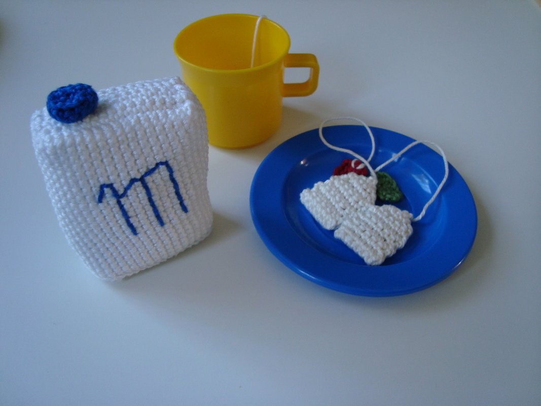 Ich biete hier eine selbstentworfene Anleitung zum Häkeln eines Frühstückssets für die Kinderküche und/oder den Kaufladen, bestehend aus: