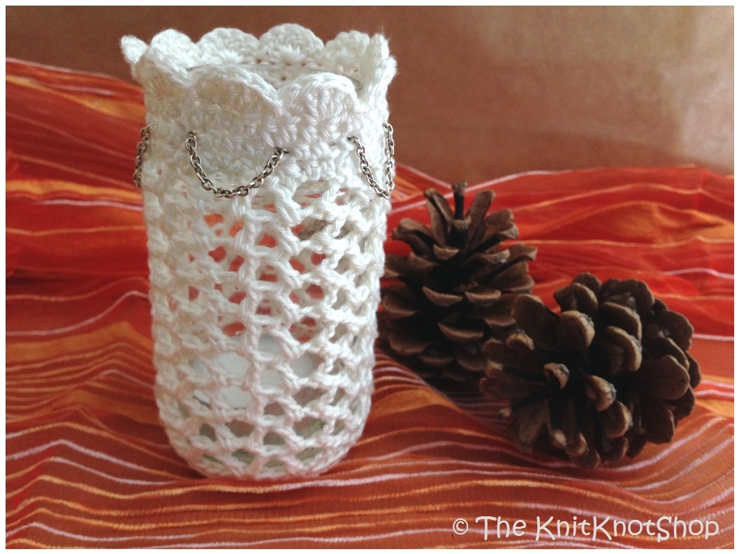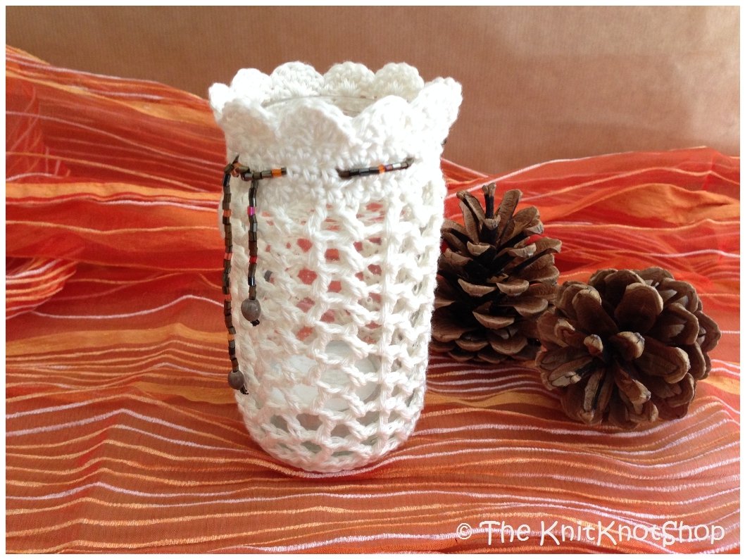 Material: Häkelnadeln Stärke 2, Wolle mit 125m/50g Lauflänge (Weiß), Nadel zum Vernähen der Fäden, ein dekoratives Band bzw. eine Kette, ein leeres Glas