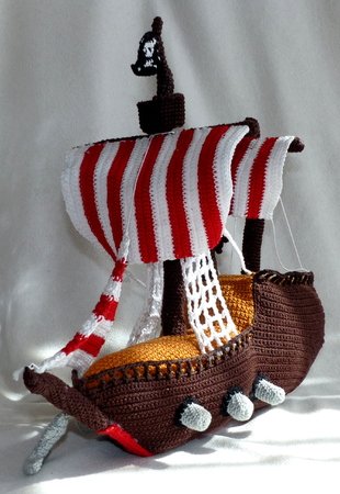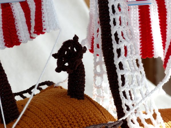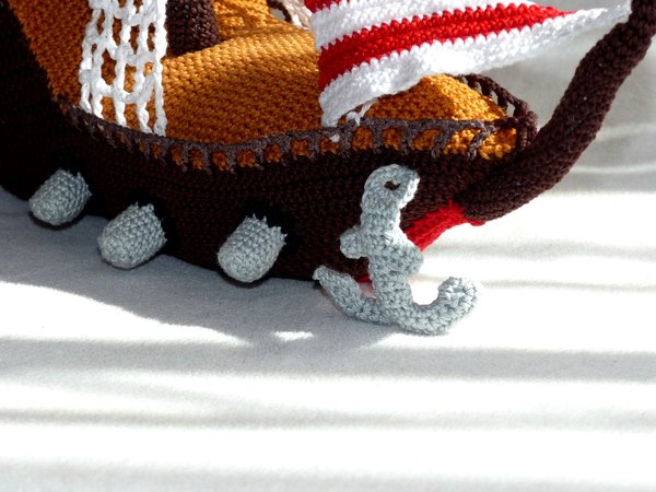 Das ganze Schiff ist mit Catania von Schachenmayr und einer 2,5er Häkelnadel gearbeitet und ist fertig circa 44 cm lang und 38 cm hoch.