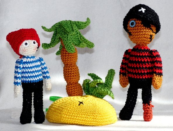 Dieses mal geht die Reise auf eine kleine Insel, bei der ein einbeiniger Kapitän und sein Pirat gerade einen Schatz suchen. Am Strand liegt das große Piratenschiff...