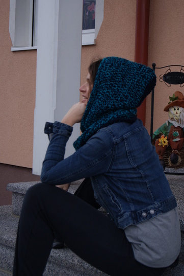 Du hast bei der Kapuze nun in Reihen hin und her gehäkelt und schlägst nun einfach die obere Kante zur Hälfte und nähst sie zusammen. Den hinteren Zipfel kannst du evtl. schräg abheften, damit er nicht so spitz wegsteht und die Kapuze eine rundere Form bekommt.