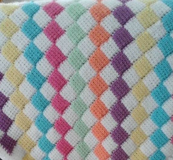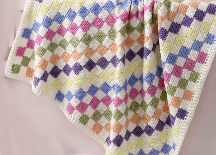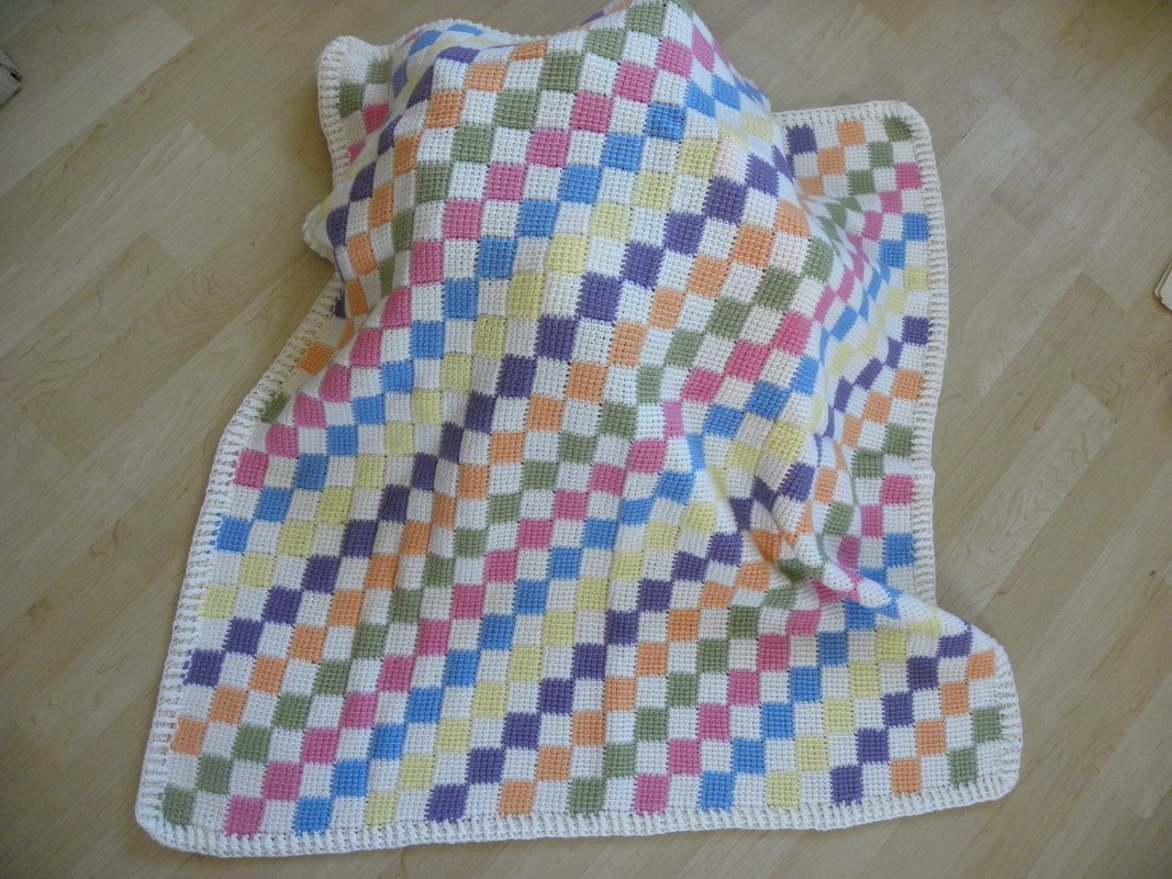 Material: Pro Lana „Baby milk“ (70% Merino fine, 30% Milk fibre, LL = 100 m/25 g), 200 g Natur (Farbe 02), je 50 g Pink (Farbe 37), Grün (Farbe 71), Lila (Farbe 48), Apircot (Farbe 28), Gelb (Farbe 21) und Mittelblau (Farbe 51) Tunesische Häkelnadel Nr. 3,5 natürlich kann die Decke auch in verschiedenen anderen Farben gehäkelt werden. Die Farbpalette der Babymilk ist sehr groß