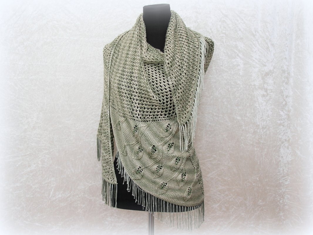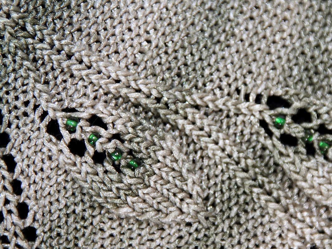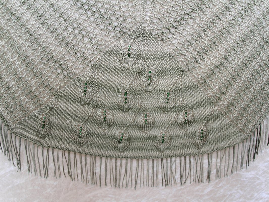 The shawl is knitted top-down starting with a traditional center stitch which will separate later. If you want, you may place beads in the leaves.