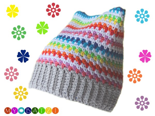 Mit dieser Häkelanleitung kannst du dir die kunterbunte Mütze "Happiness" häkeln. Der große Vorteil bei dieser ist, dass die Mütze ohne jegliche Rundenzunahmen gehäkelt wird und so für jeden Anfänger umzusetzten ist.