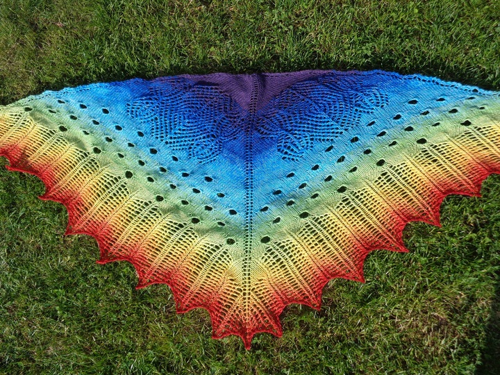 Die verschiedenen Strickmuster unterstreichen die Farbe der Wolle und somit auch die Witterung. Zuerst ziehen Wolken auf, aus denen es riesige Tropfen regnet, schließlich wärmen die Sonnenstrahlen das Gemüt. Regenbogenwolle inspiriert zum Strickmalen und lässt so ein wunderschönes Kunstwerk entstehen.